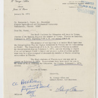 After the Department of H.E.W. ordered Florida to submit its desegregation plan by early February 1974, Chairmans of the Black Coalition for Education, W. George Allen and Gilbert Porter, gathered B. L. Perry and other HBCU leaders to develop a plan. Perry mentions potentially filing ‘a minority report’ and clarifies ‘opinionated’ misinformation.