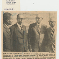 Sourced from the Palm Beach Post, this newspaper clipping is a literal snapshot of the state of Black higher education in the early 1970s. The photograph depicts four HBCU presidents, Dr. B. L. Perry, Dr. Royale Puryear, Dr. William Stewart and Richard V. Moore, meeting at Florida A&M University to discuss Florida student opportunities.