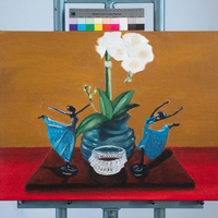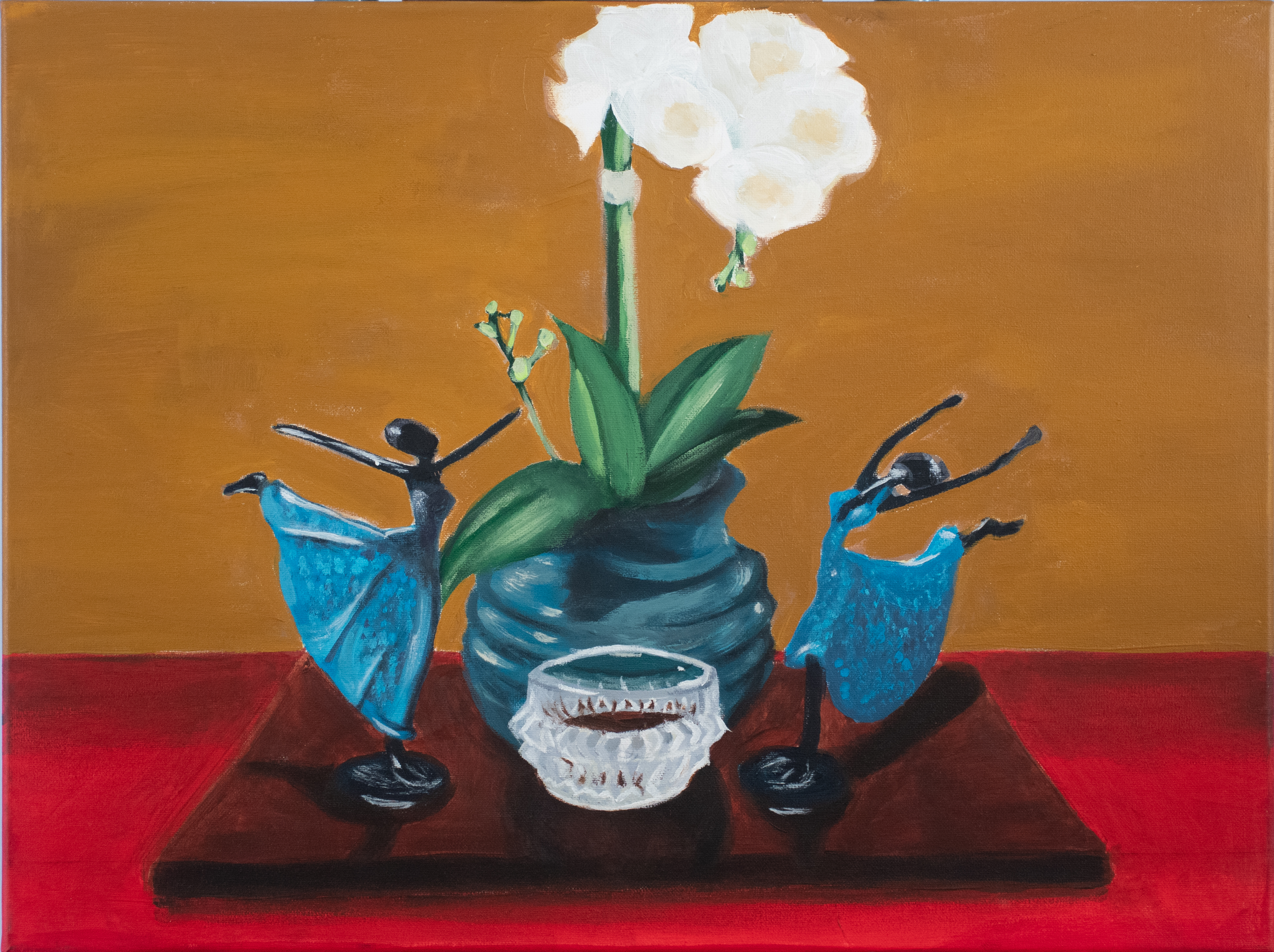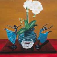 Etienne created her painting, “Dancing Still Life,” as part of a class assignment based on objects within her home. Etienne selected these figures, which her mother collected from the National Museum of African American History & Culture, white orchids in a blue pot, and a glass dish from her grandmother's home. A graduate from Texas Southern University, Etienne emphasizes femininity, movement, and flowers in her art.