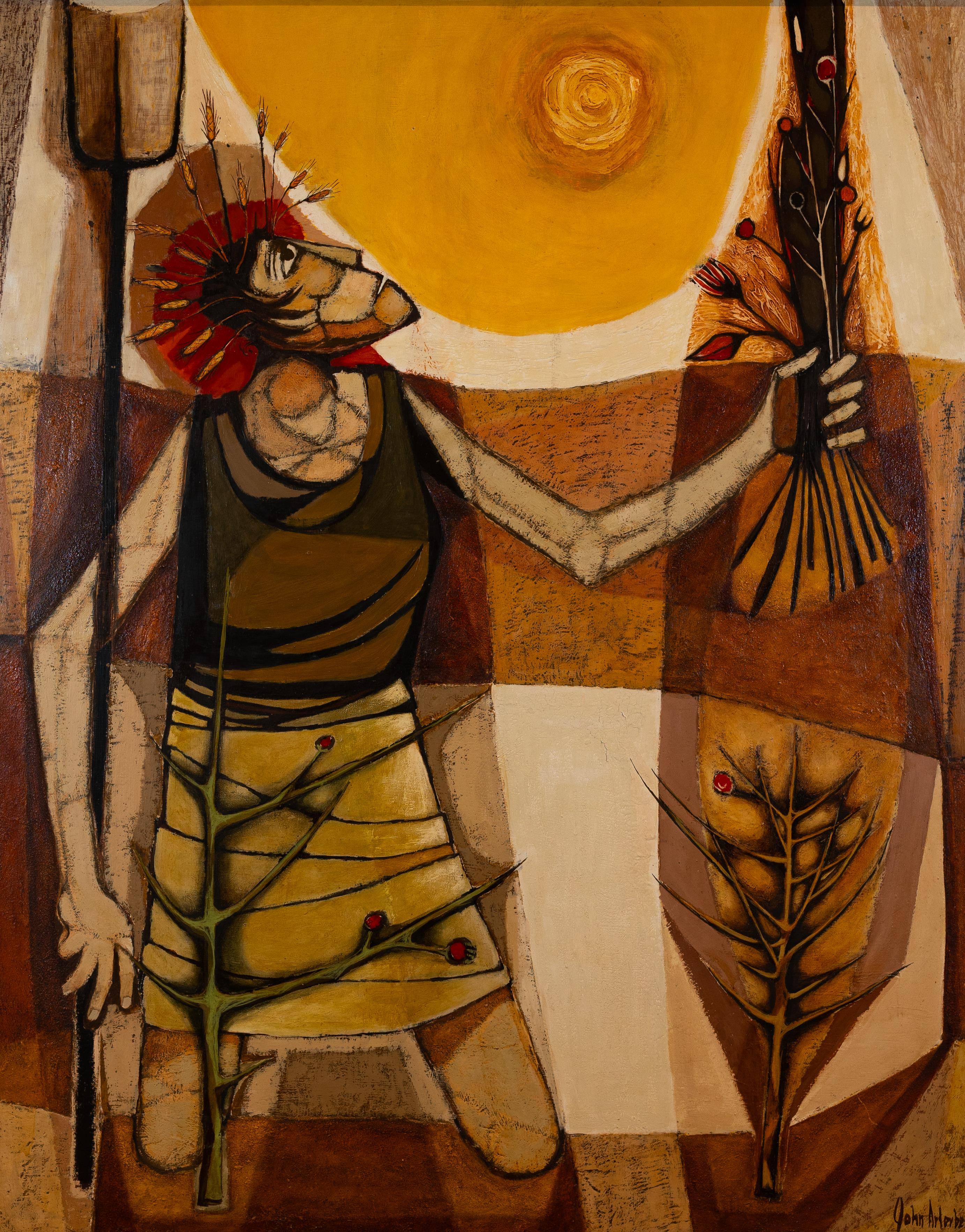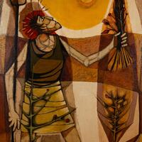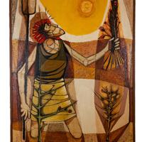 John Arterberry was an artist who worked in the art department at Langston University from Tallahassee, FL. Ceres depicts the Roman goddess of agriculture, grain crops, and fertility, looking toward the sun. Ceres wears a crown of wheat stalks and holds a pitchfork in one hand and a bouquet of poppies in the other.