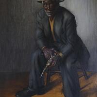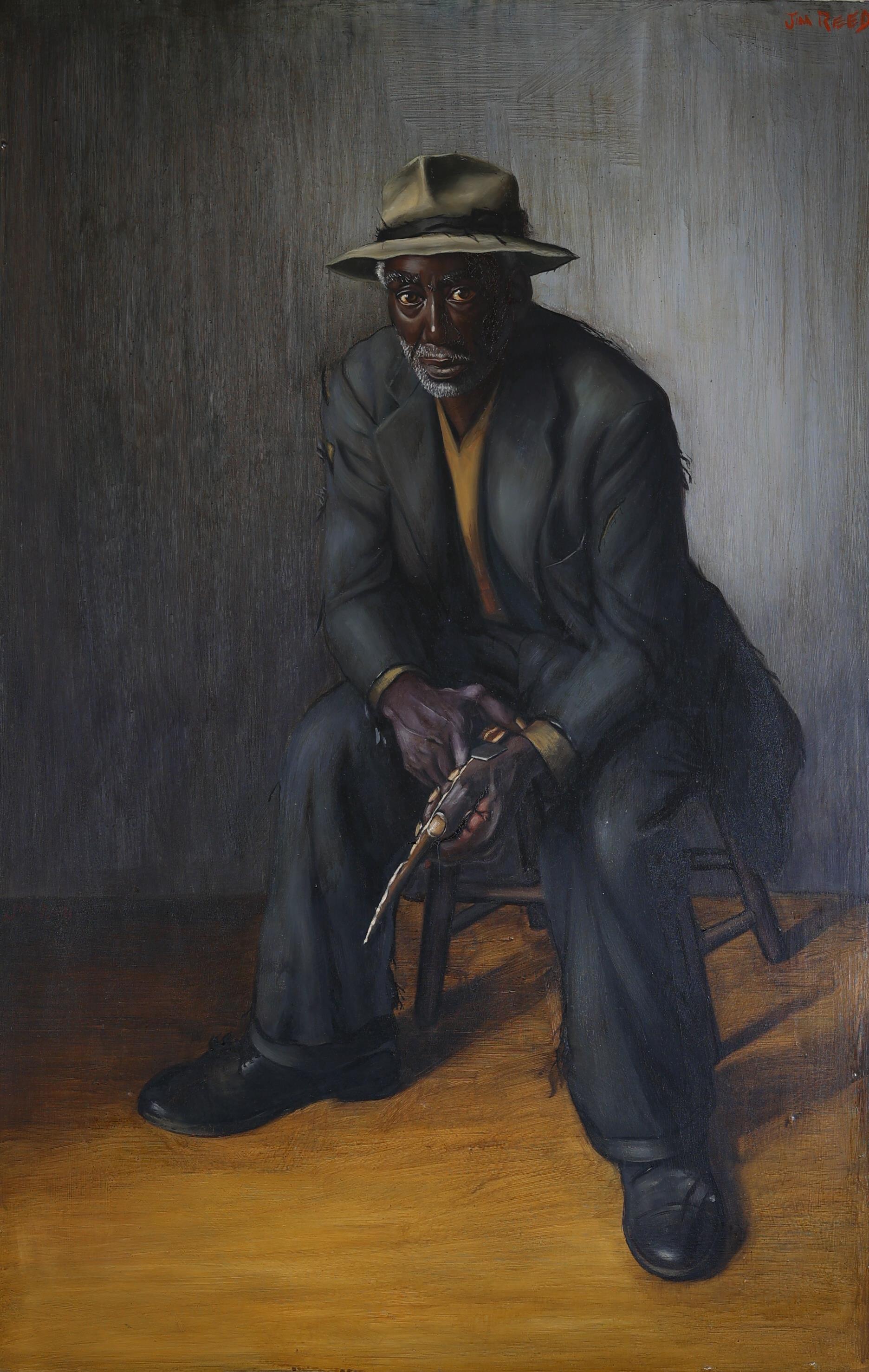 James Reuben Reed was a painter born in Kansas City, MO. Depressed is an oil painting of a seated man wearing a tattered gray suit, a hat, and black shoes. He is leaning forward, whiting a piece of wood and looking toward the viewer.