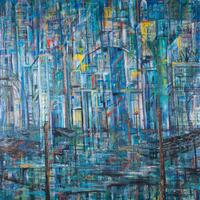 Jewell Woodard Simon was an internationally acclaimed artist, teacher, and poet from Houston, TX. Ghost Harbour City depicts an urbanscape and a dock with moored boats. Horizontal and vertical lines shape the city and water and create depth. Simon blends colors to detail the light, shadow, and shape of each building and the seascape.
