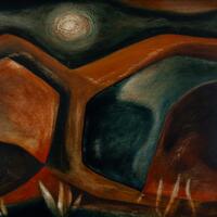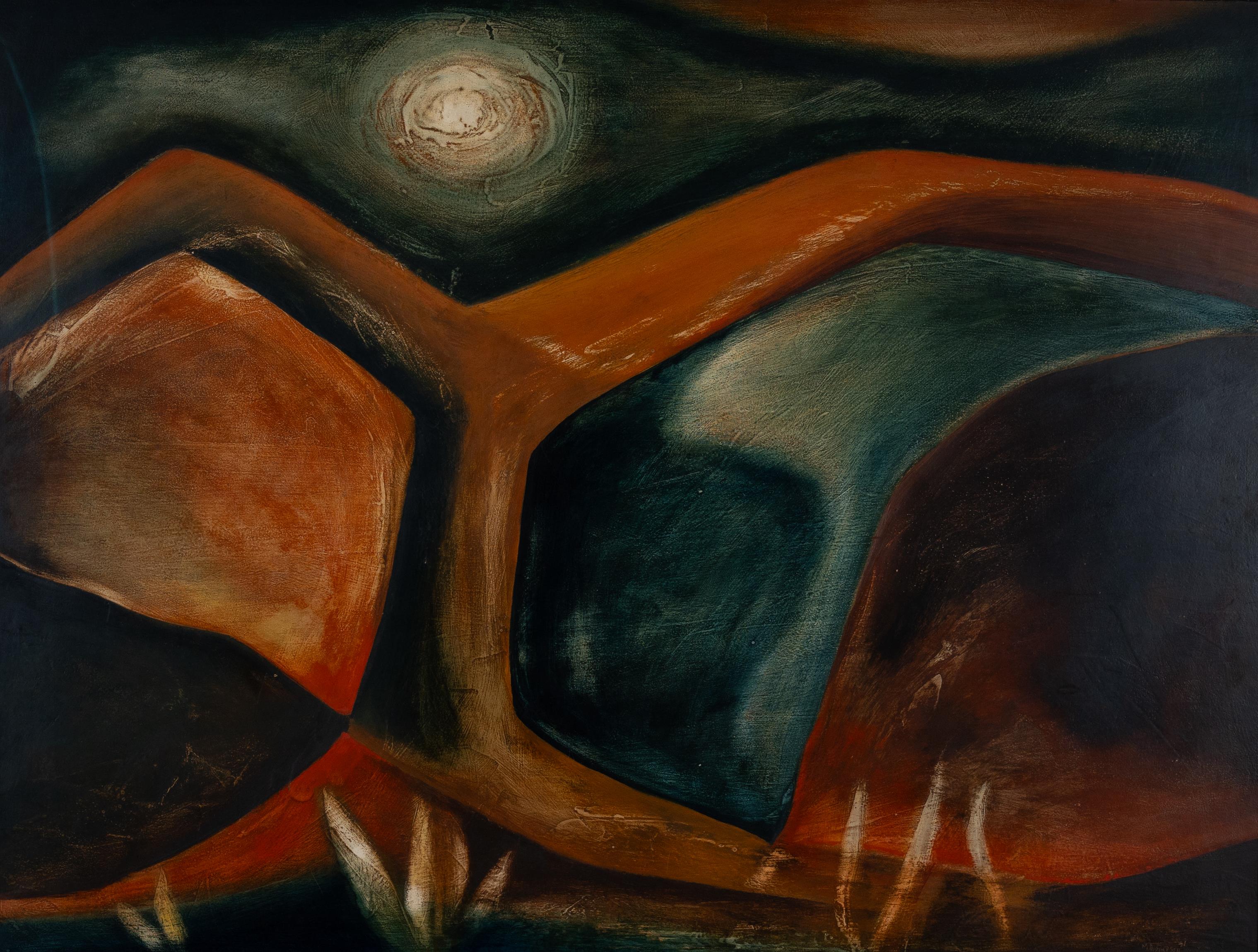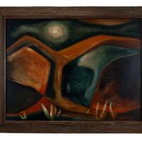 Merton D. Simpson was an abstract expressionist painter and African art collector. Landscape Symphony is an abstract landscape that depicts a white sun with hues of a dark blue-green sky. The connected polygons of vibrant red, green, and orange are the main emphasis of the piece. They reach three bunches of short highlighted strokes in the landscape.