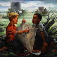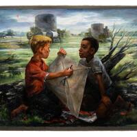 Cecil D Nelson Jr. was a 20th-century painter born in Champaign, IL. The Kitemakers shows two children sitting in a field before a log. A white boy on the left wearing a red shirt holds the kite while looking at a young Black boy on the right wearing a blue shirt. An orange kite flies in the background near two gas tanks and a grain bin.