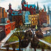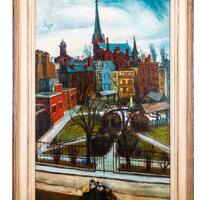 John Woodrow Wilson, a sculptor, painter, and printmaker from Roxbury, MA, was known for his creative portraits and stylistic approach to social justice. Roxbury Landscape shows a gated park under a blue, white, and yellow sky.  Behind other buildings, there is a tall church and a courtyard with bare trees, depicting Autumn in Wilson’s hometown.