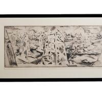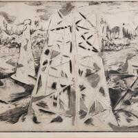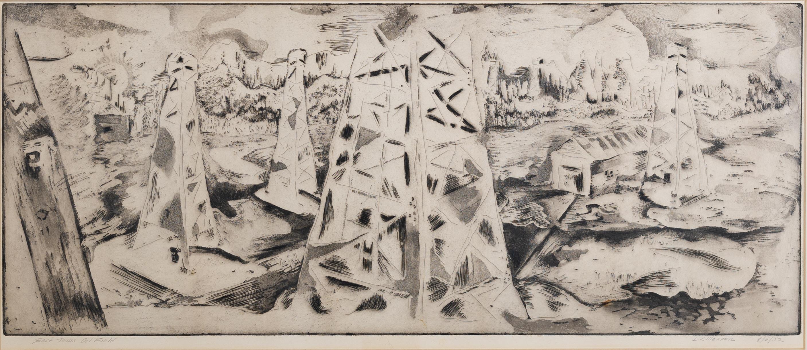 Leroy C. Weaver was an artist and art educator from Prarie View, TX. East Texas Oil Field is a print depicting an oil field in East Texas. The print features several oil rigs and workers' living quarters. In the background, a landscape of forest and trees is visible. The drawing shows the oil field from a pilot's perspective.