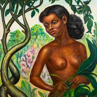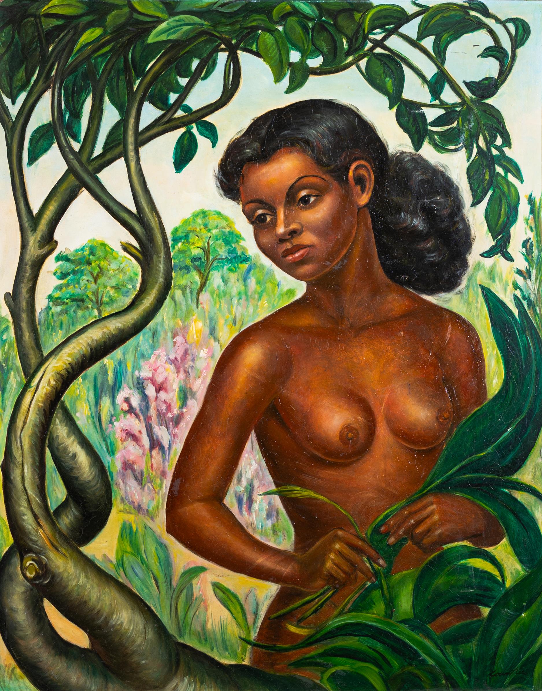 Samuel Albert Countee was a New Negro movement painter and sculptor from Marshall, TX. Brown Girl depicts a nude Black woman in nature. She has a thoughtful expression as she touches the branches that obscure her groin. In the background is a garden scene of pink flowers and lush trees.