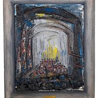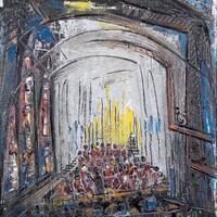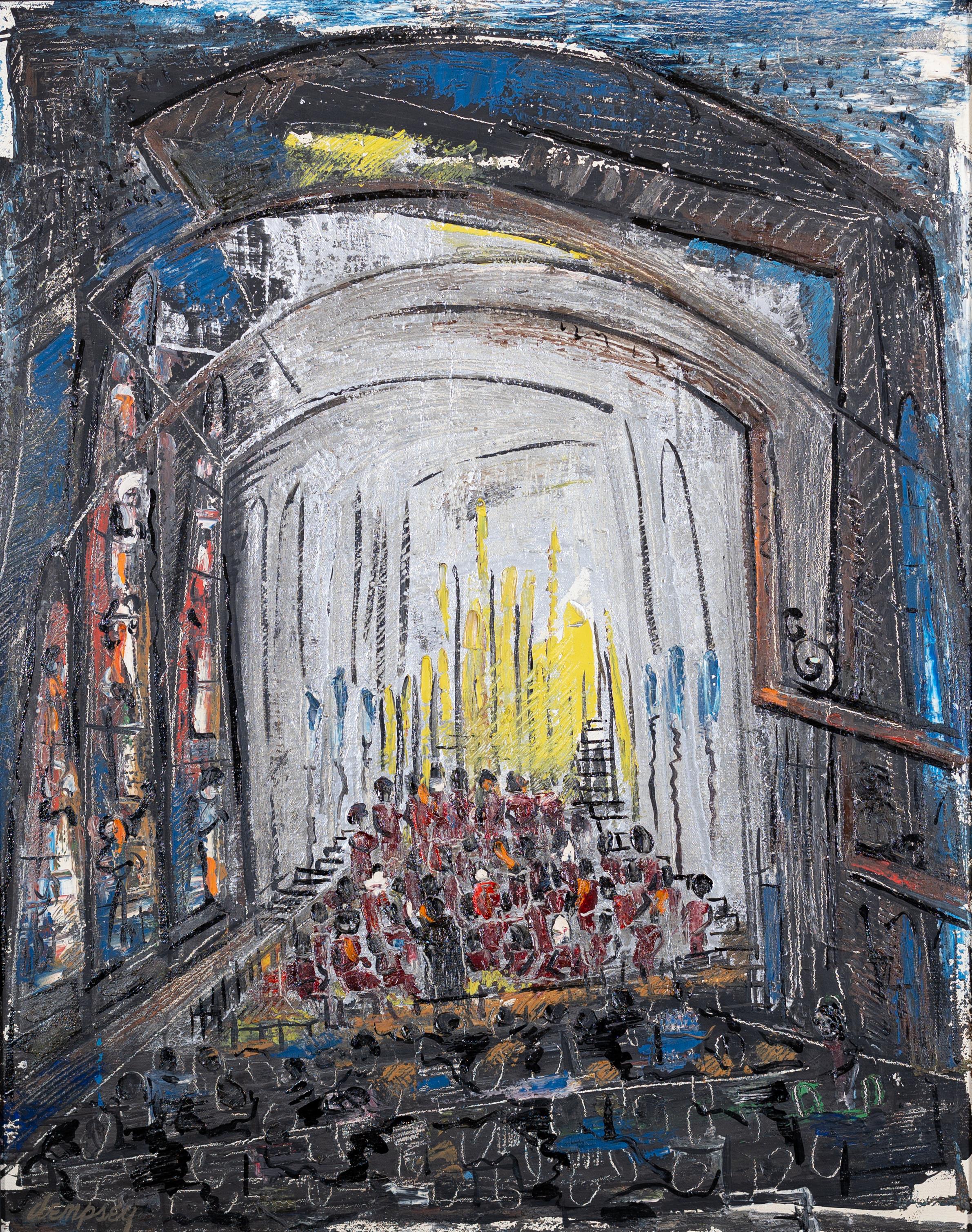 Richard Dempsey was a painter known for his abstractions and portraits of prominent African American leaders from Washington, D.C. Cathedral and Choir is an impressionist depiction of the inside of a church. The yellow brushstrokes create a tall organ alongside stained glass; the layered reds, blues, and black show the congregation and choir.