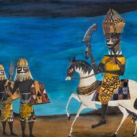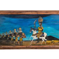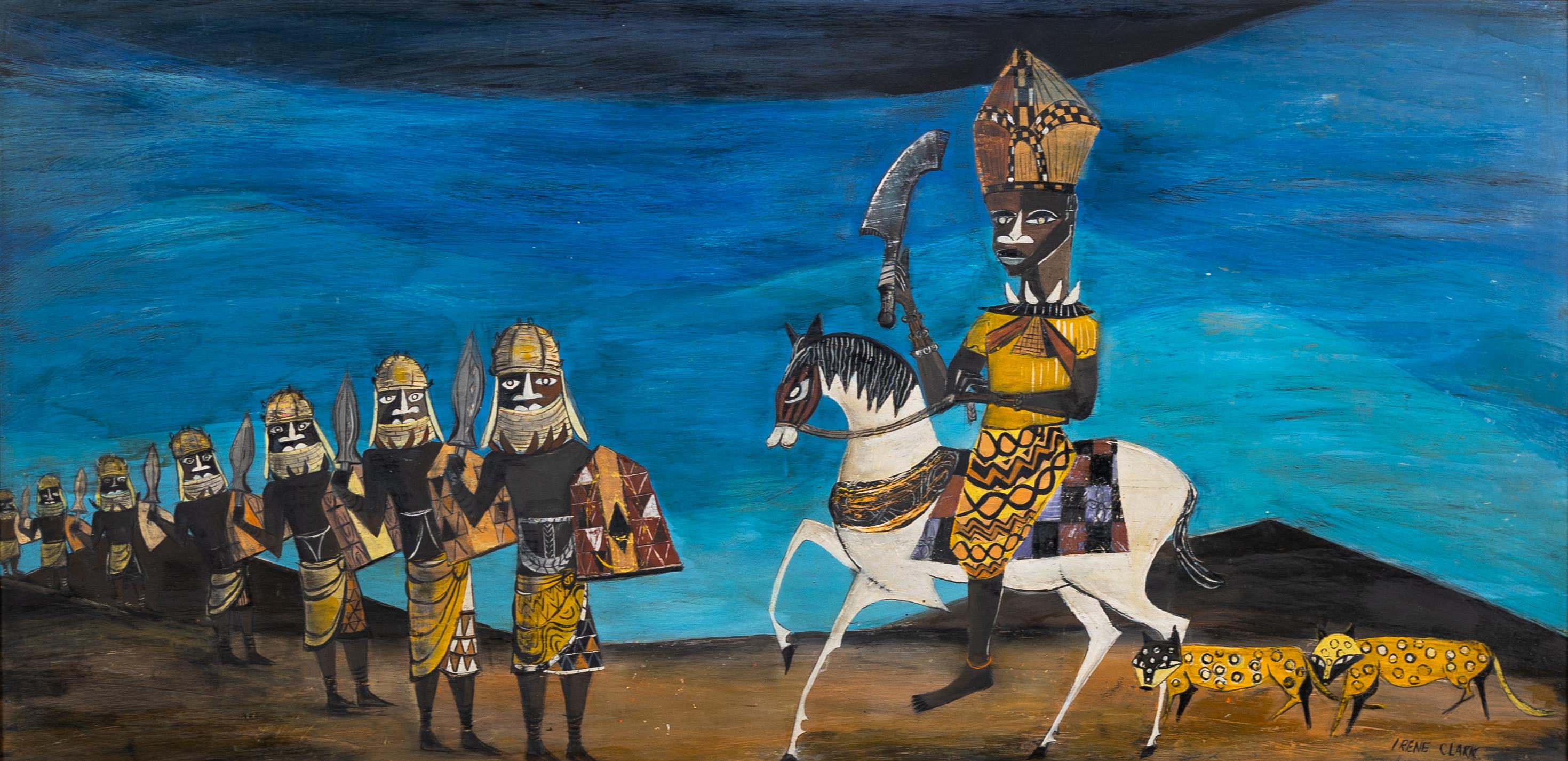 Irene V. Clark was a diasporic folklore artist from Washington, D.C. Five Centuries Ago depicts Black warriors preparing for battle. In the lead is a man on a horse holding a weapon with an animal by his side. He faces the warriors who follow him as they march under a dark blue sky.