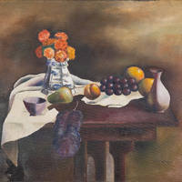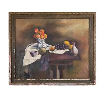 William S. Carter was an abstract, landscape, still-life, and figurative painter from St. Louis, Missouri. Still Life embodies its namesake by depicting a table of commonplace objects with a muted background. Carter's subjects include a teacup, a vase with flowers, fruit, a feather, and an empty vase on top of a haphazard cloth.
