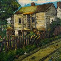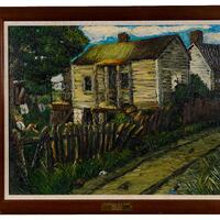 Clarence Laudric Shivers was an artist and career military man who participated in the Tuskegee Program from St. Louis, MO. The House by the Side of the Road depicts a rural home behind a picket fence. This piece conveys rural life as a man lounges on a tree while clothes dry on the line.
