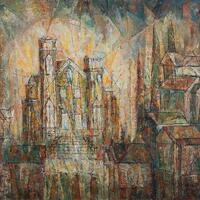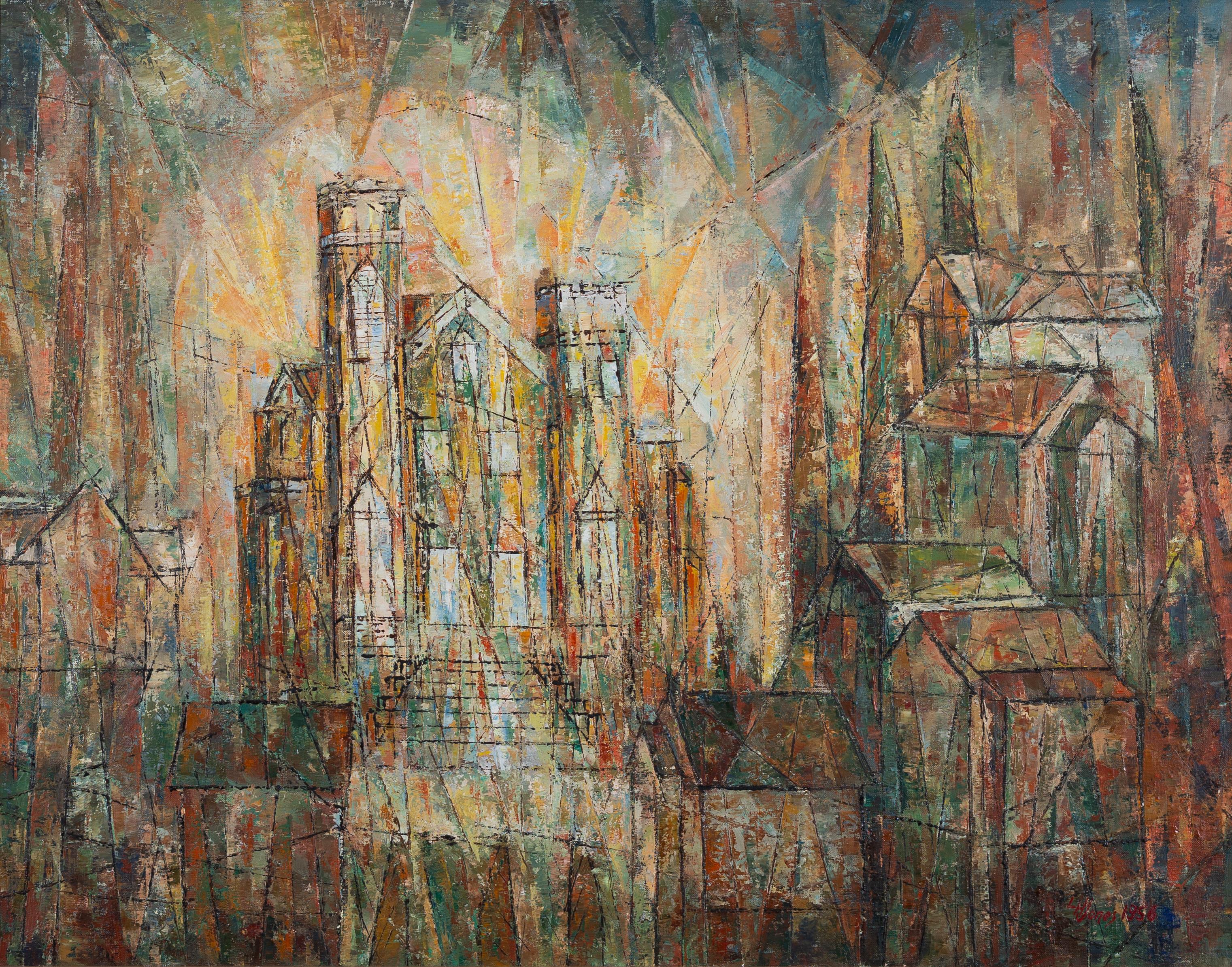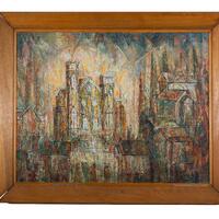Leonard Jones was an artist from Winston-Salem, N.C. Cathedral is a cubist depiction of a cathedral and the town surrounding it. Jones uses a variety of light and dark colors that resemble the aesthetic of stained glass.