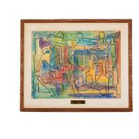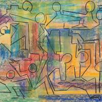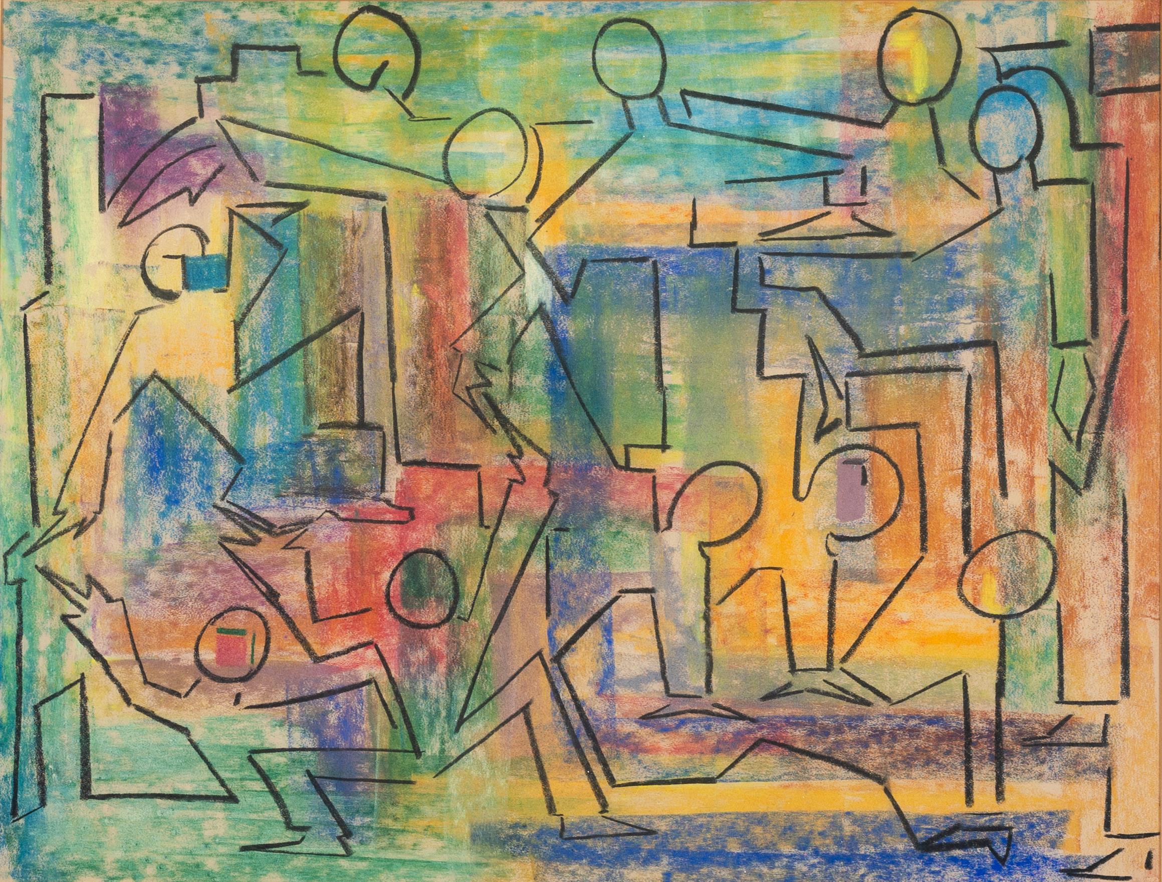Gerald F. Hooper, Sr. was an artist from Tallahassee, FL. Figures is a study of 10 figures in movement. Hooper uses circles and quadrilaterals to frame the moving figures. The background is a collage of colorful wax strokes.