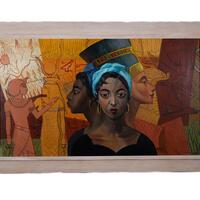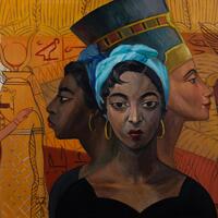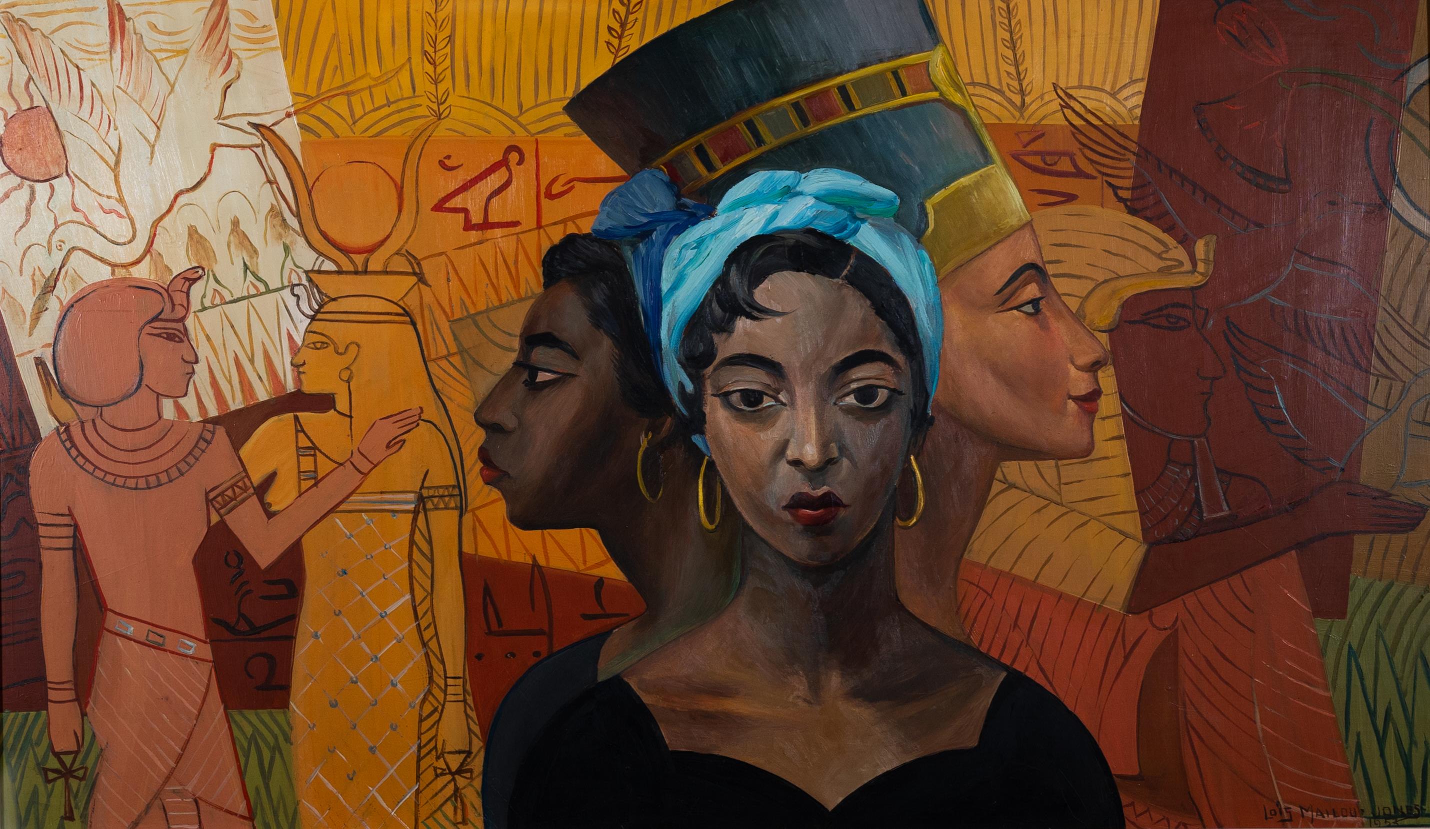 Lois Mailou Jones was an artist and art educator known for her costumes, textile designs, watercolors, paintings, and collages from Washington, D.C. Egyptian Heritage presents a genealogical and cultural heritage between contemporary Blacks and Ancient Egypt. Jones uses Ancient Egyptian scenes and hieroglyphics in the background.
