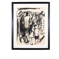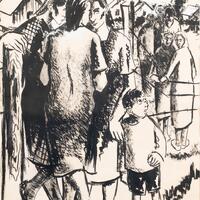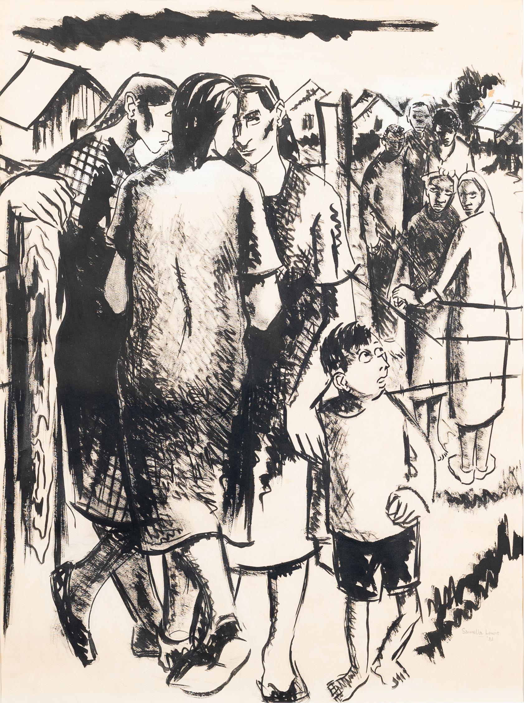Samella Sanders Lewis was a printmaker, painter, sculptor, and art historian from New Orleans, LA. Barrier is a drawing that depicts the physical and social barriers between groups of people. In the foreground, three women and a boy suspiciously look at a group of townspeople who return their stare from the other side of a barbed wire fence.