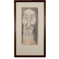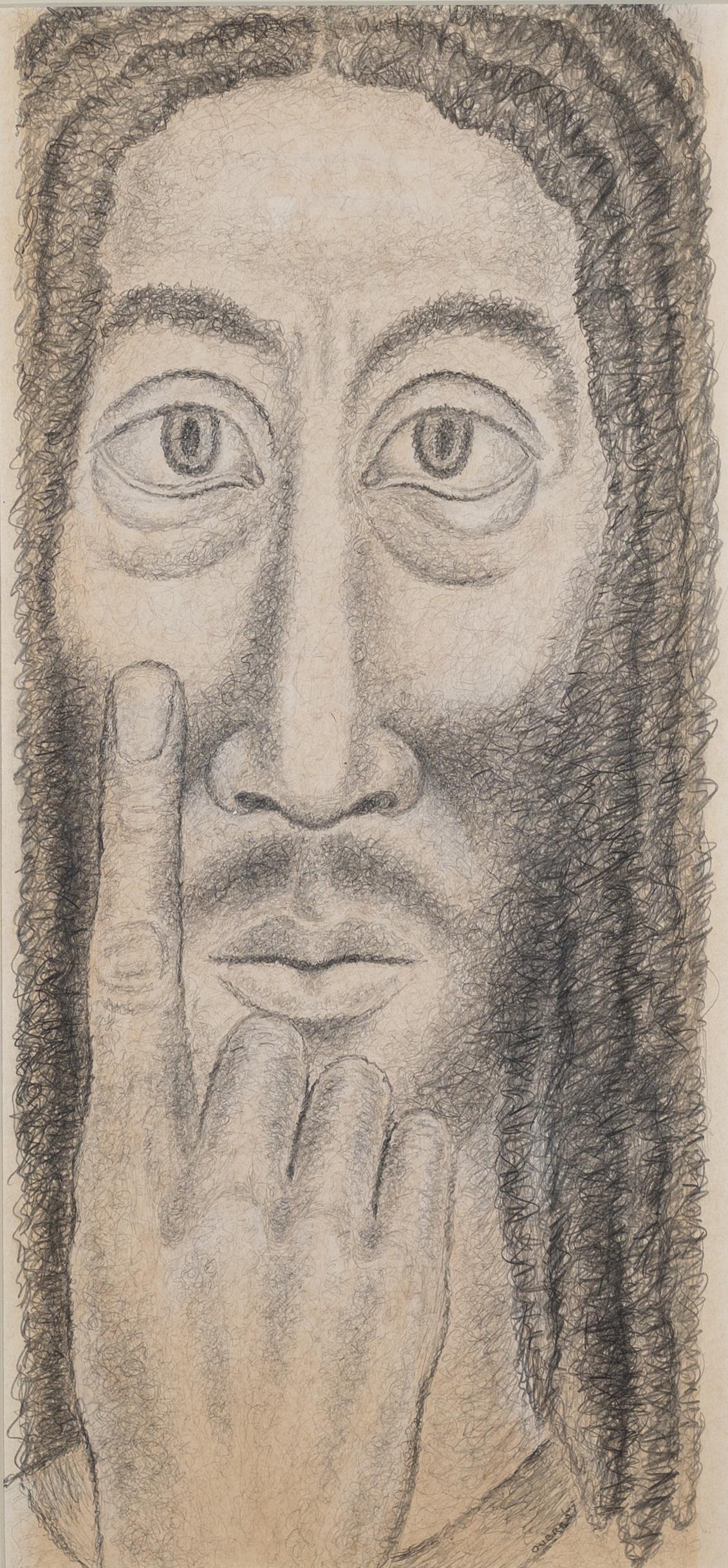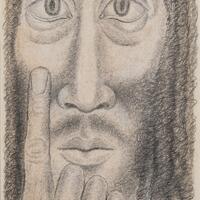 Hayward Oubre was a multimedia artist and educator from New Orleans, LA. Verily, I Say Unto You depicts a modern portrait of a Black Jesus. Jesus is drawn with an elongated nose with wide nostrils, large eyes, pursed lips, locs, and a raised finger.