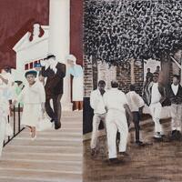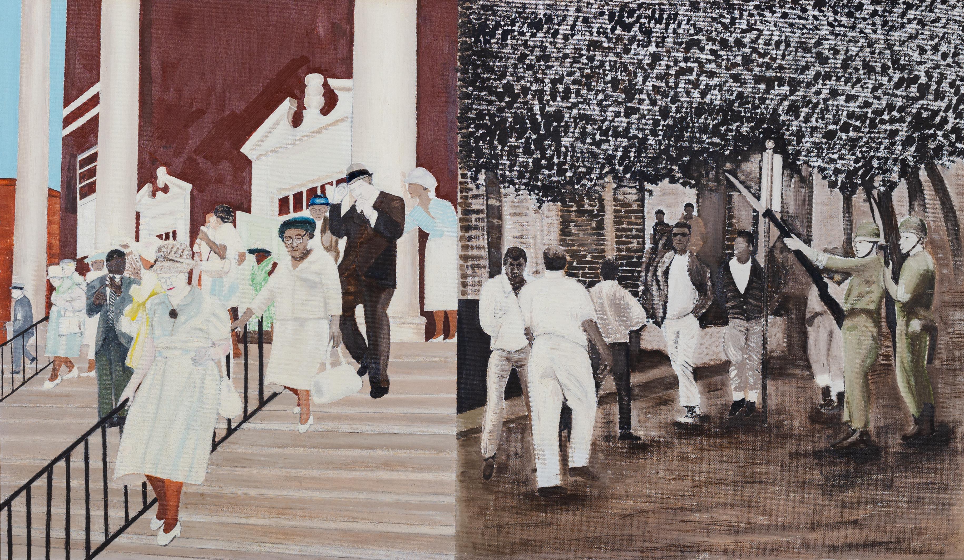 Al Tyler was an artist known for his figurative murals and landscape paintings. Prayer for Freedom shows two scenes from the fight for Civil Rights. On the left, black and white people are leaving a courthouse, and on the right, armed officials are stopping Black men from entering a building.