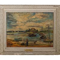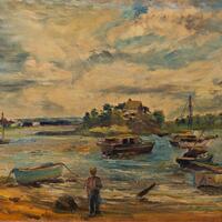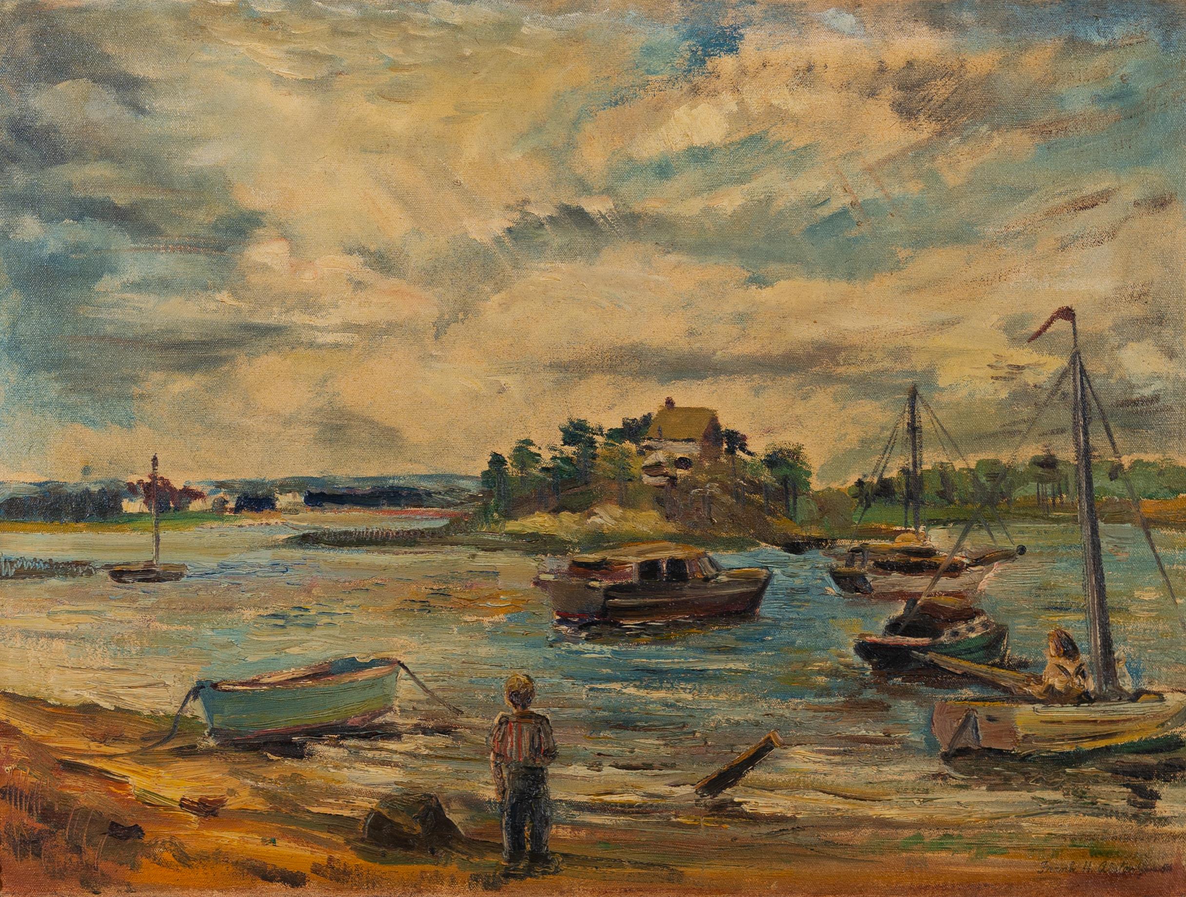 Frank H. Alston, Jr. was an artist and teacher from Providence, RI. Morning on Cape Cod illustrates a cloudy morning along the coast of a peninsula on the Massachusetts Coast. The image depicts a boy standing at the shoreline, boats sailing across the water, a house on top of a hill, and a residential area in the distance.