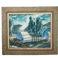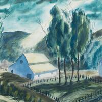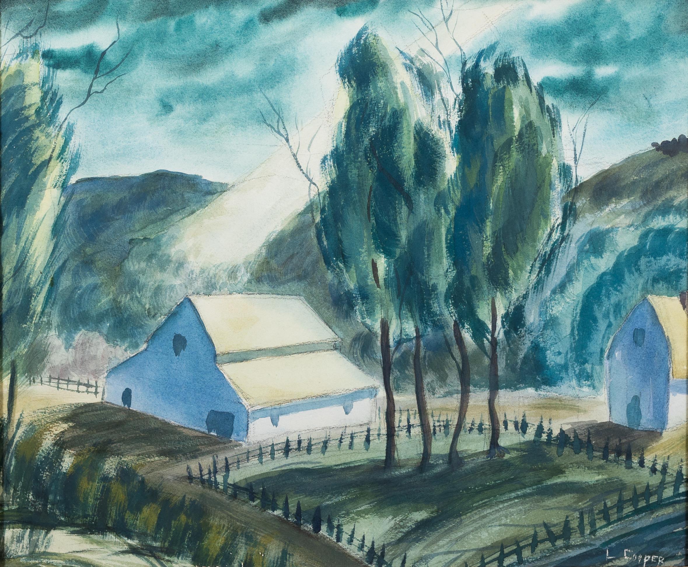 Leonard Cooper was a painter, musician, and piano teacher from Salinas, CA. Before the Rains Came illustrates a rural landscape prior to a rainstorm. It depicts two barns, a thicket of trees, a fenced area, and rolling hills under a dark cloudy sky.