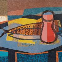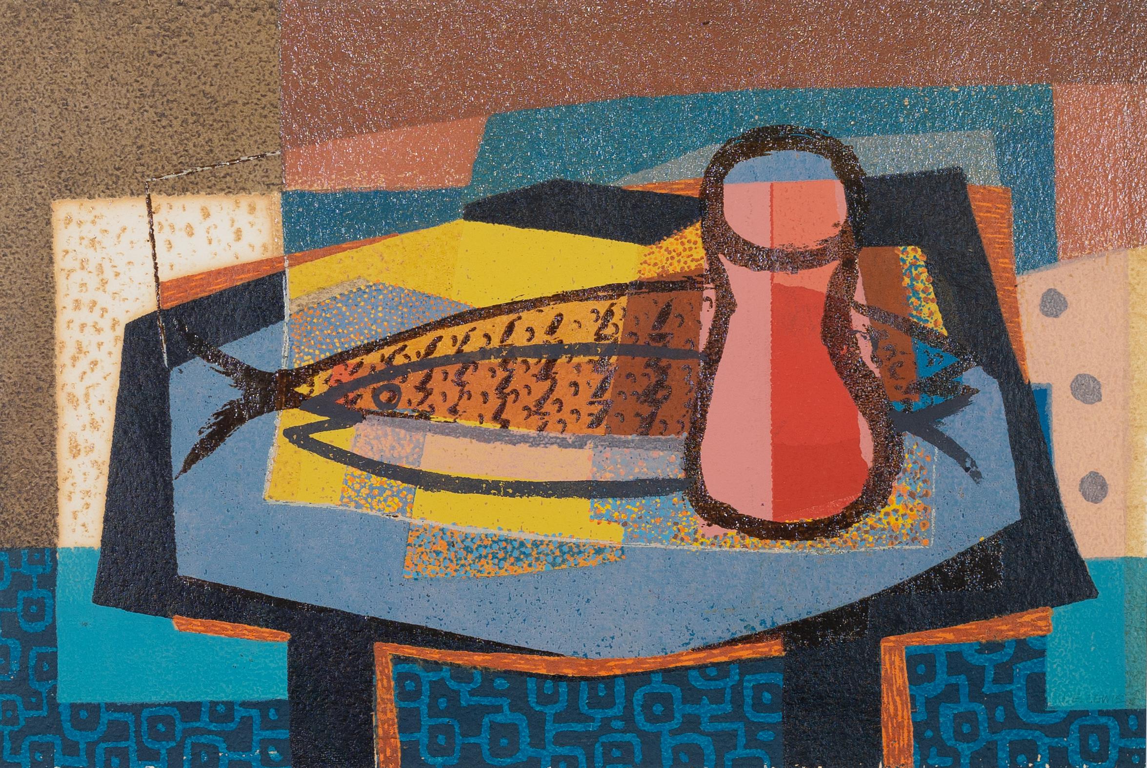Howard E. Lewis was an Art professor and Korean War veteran from Columbus, OH. Still Life with Fish is a watercolor depiction of two fish and a vase on a table. Lewis uses stark shapes, colors, and patterns to create the fish, vase, table, and background.