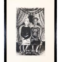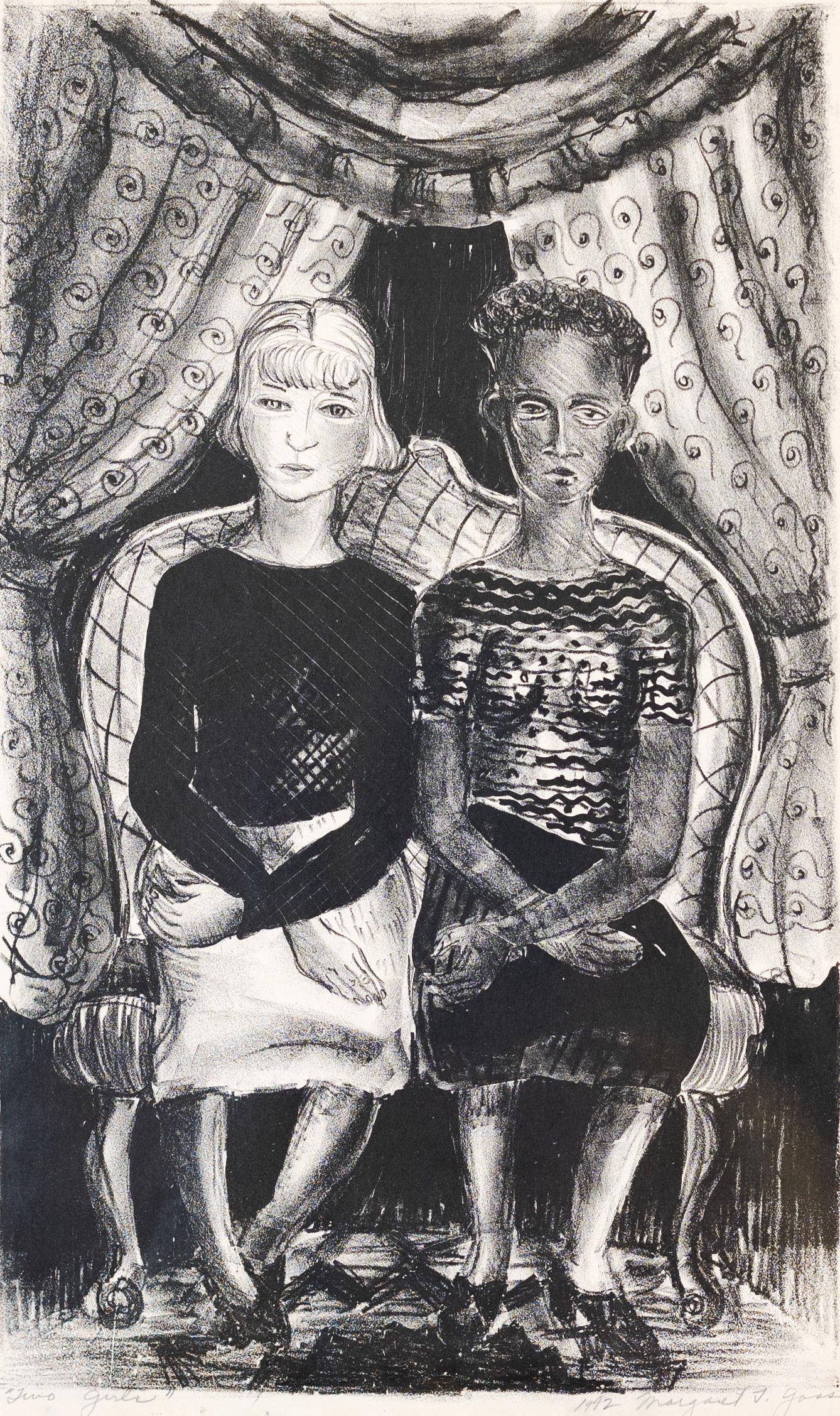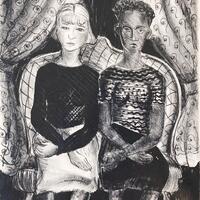 Margaret Taylor Goss Burroughs was an artist, historian, teacher, and writer from St. Rose, LA. Friends is a print depicting an interracial friendship. Two girls, one black and the other white, are sitting on a loveseat in front of a patterned curtain. This radical image of race relations was created during the height of the Jim Crow era.