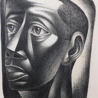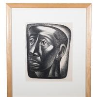 Born in Chicago, Charles White was a painter, printmaker, muralist, and educator known for his stylistic approach to Black subjects. Youth is a lithograph portrait of a young man looking into a far-off distance. Cross-hatching contrasts shadow and light across the young man’s face.