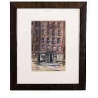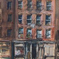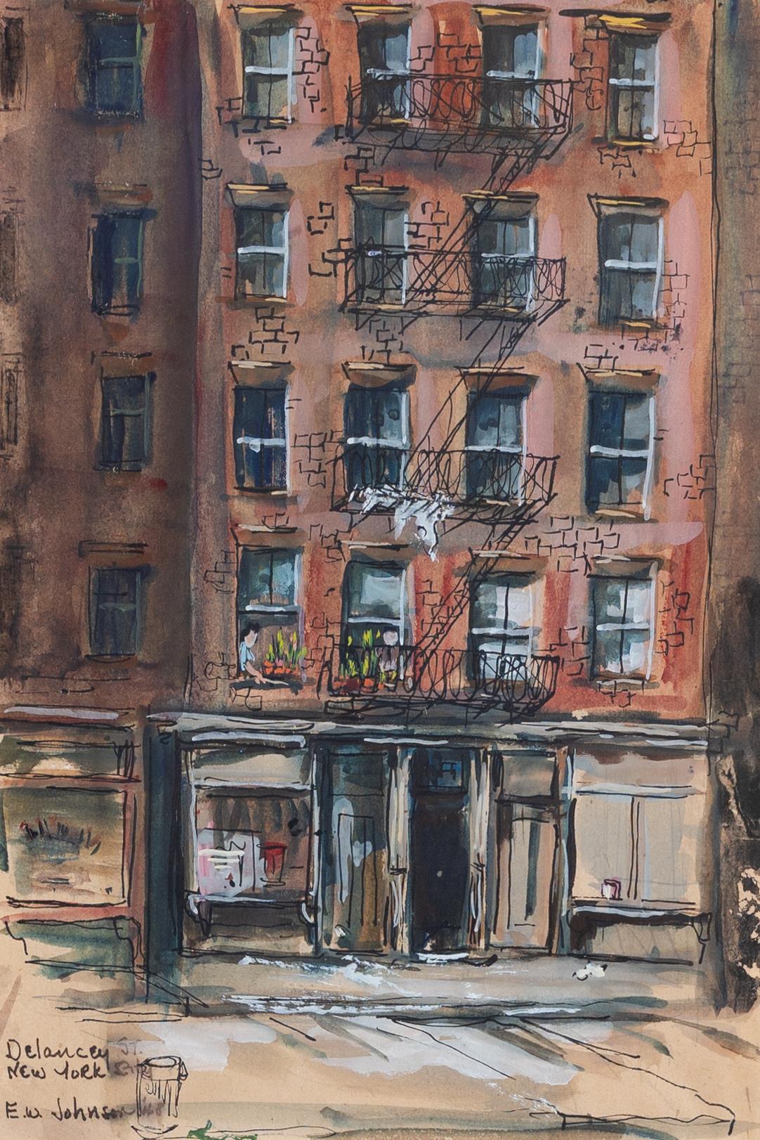 Estella W. Johnson was an artist from New York, NY. Delancey Street, N.Y.C., is a watercolor depiction of a multi-use building in New York. There is a red brick apartment above a storefront with a fire escape. There is also a woman watering plants out of her window.