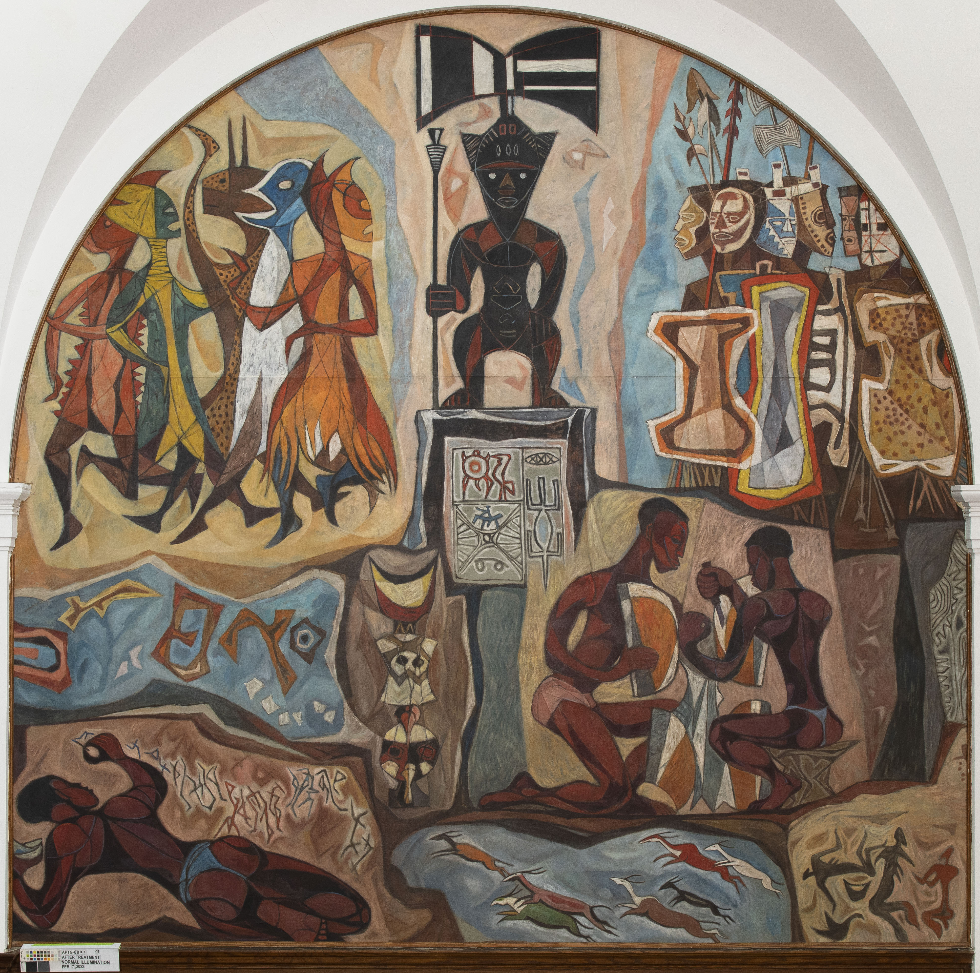 Hale Aspacio Woodruff was an artist and art educator known for his murals, paintings, and prints from Cairo, IL. Native Forms, the first panel in the Art of the Negro mural series, illustrates the range, diversity, and function of art in traditional African societies.