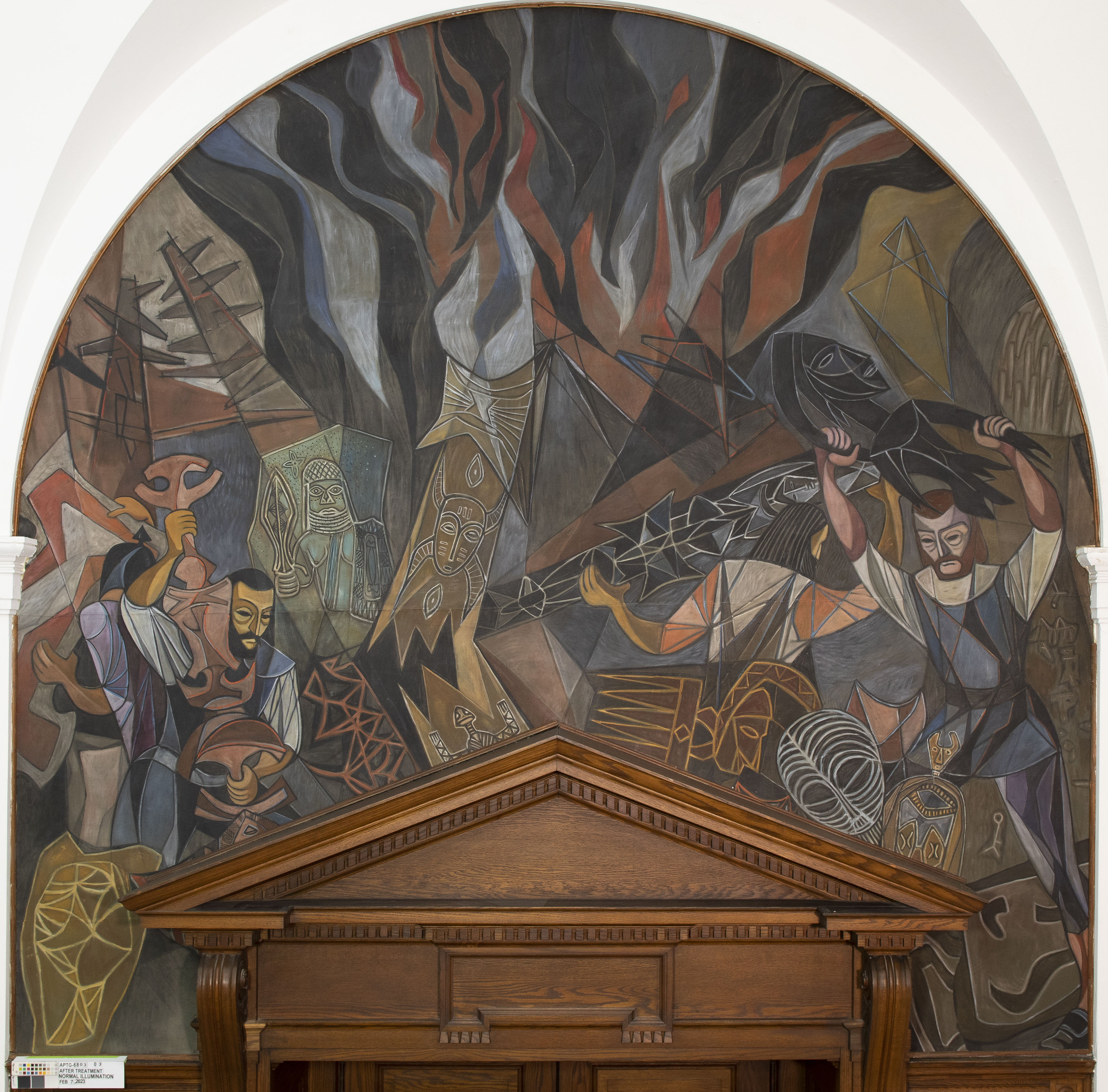 Hale Aspacio Woodruff was an artist and art educator known for his murals, paintings, and prints from Cairo, IL. Dissipatation, the third panel in the Art of the Negro mural series, portrays the theft and disruption of African art and culture by Europeans through colonization.