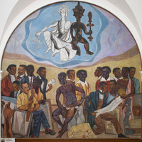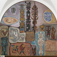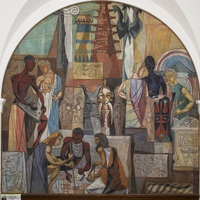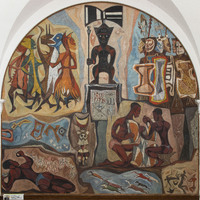 Hale Aspacio Woodruff was an artist and art educator known for his murals, paintings, and prints from Cairo, IL. Parallels, the fourth panel in the Art of the Negro mural series, shows the innate connection between non-European indigenous cultures despite geographic divisions.
