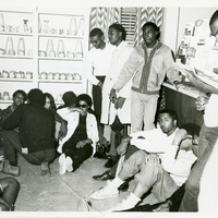 Black and white image of several Tuskegee students protesting in Dorothy Hall and locking themselves and the Board of Trustees in a room.