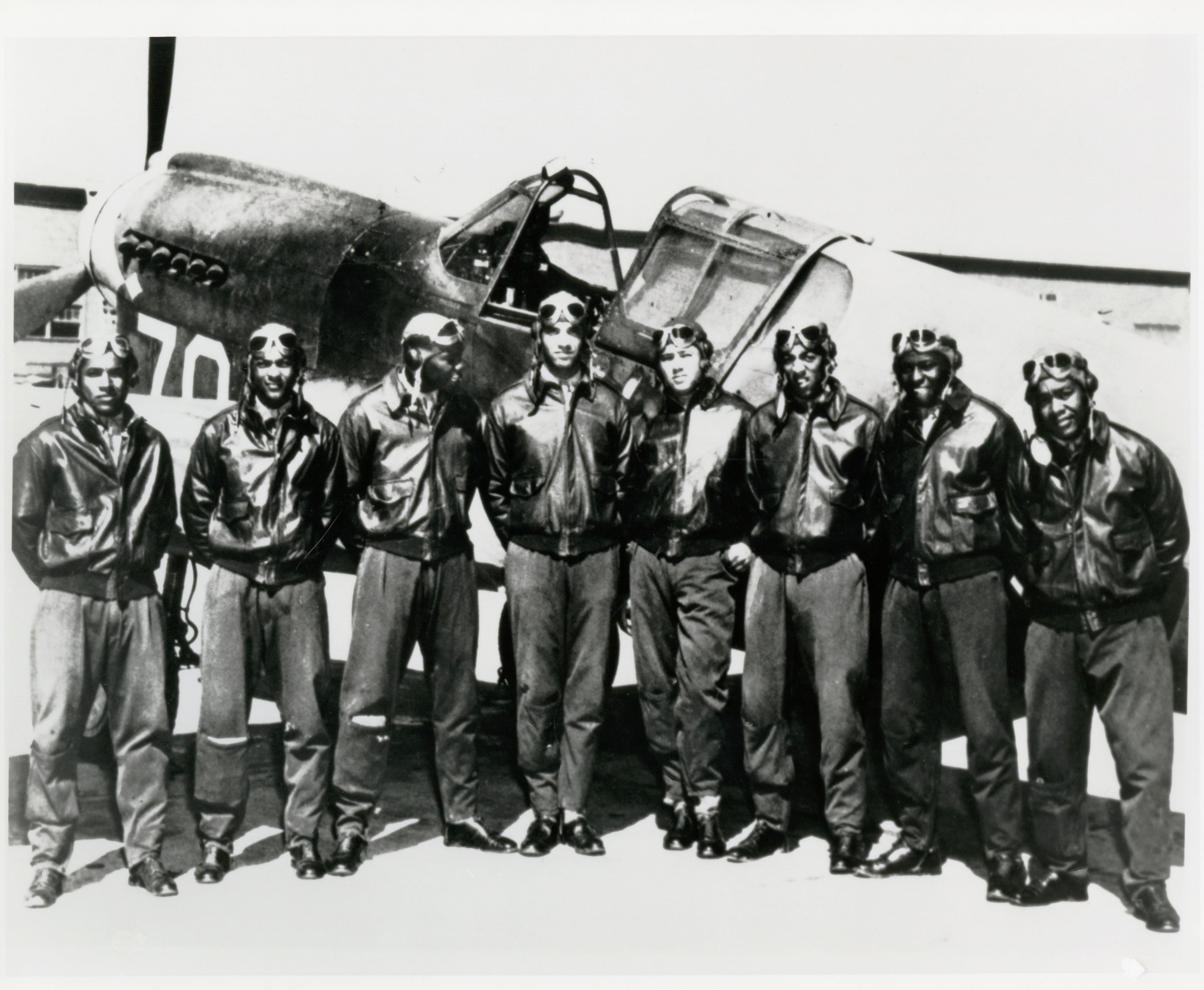 Black and white image of the ninety-ninth squadron of Tuskegee Airmen posing in front of an airplane.