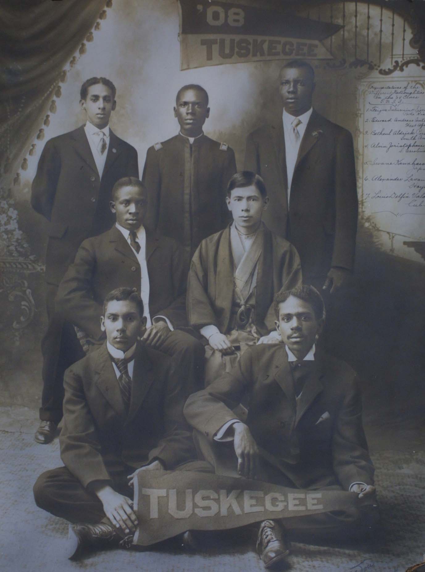 This black and white photograph features representatives from various nationalities in the 1908 class at Tuskegee Institute.
