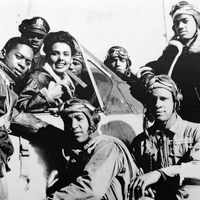 A black and white image of legendary actress and singer Lena Horne with the with seven Redtails at Moton Airfield.