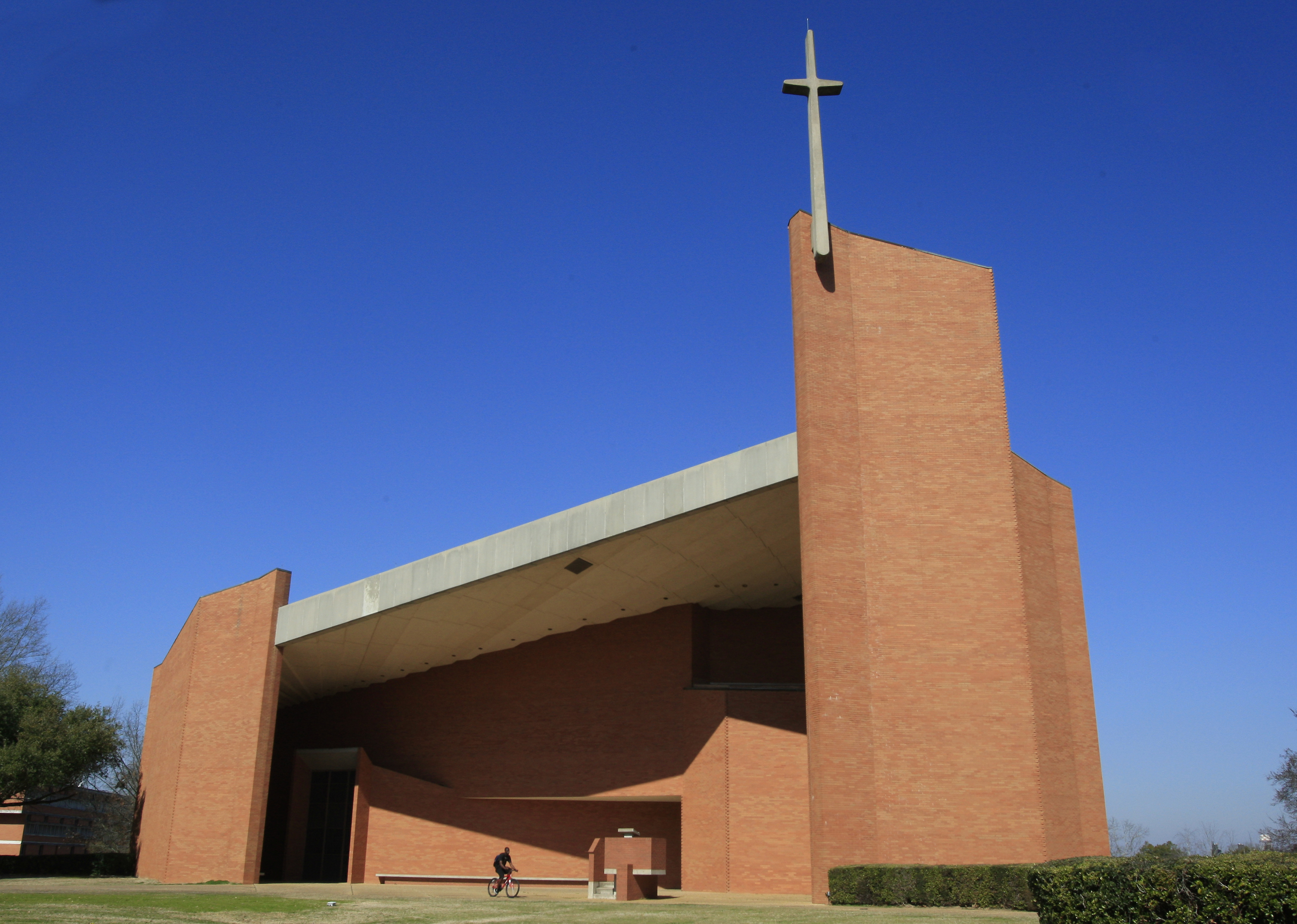 A colored image of a Tuskegee student riding a bike in front of the new Chapel Building.
