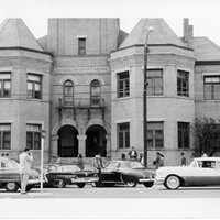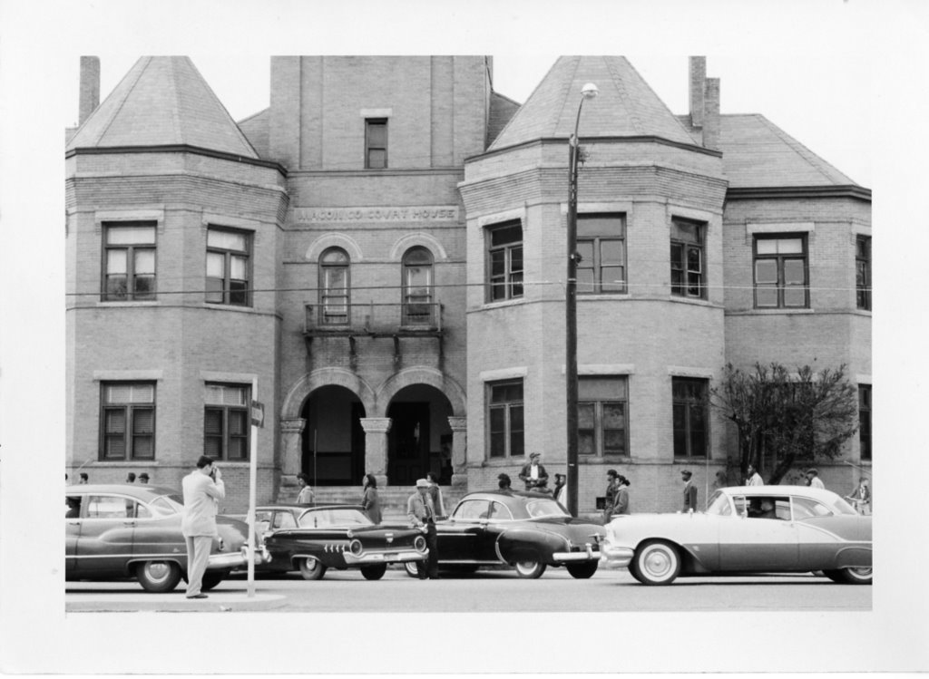Black and white image of of a Civil Rights March of Tuskegee Institute students and community members in from of the Macon County Court House.