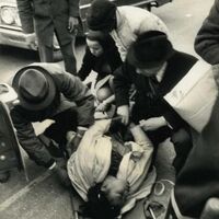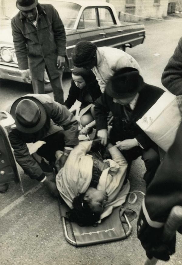 Black and white image of the aftermath of march taken by Prentice H. Polk. A young Black women is being laid out on a stretcher.