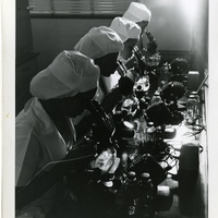 Black and white image of four Carver Research technicians looking at cells via a microscope.
