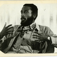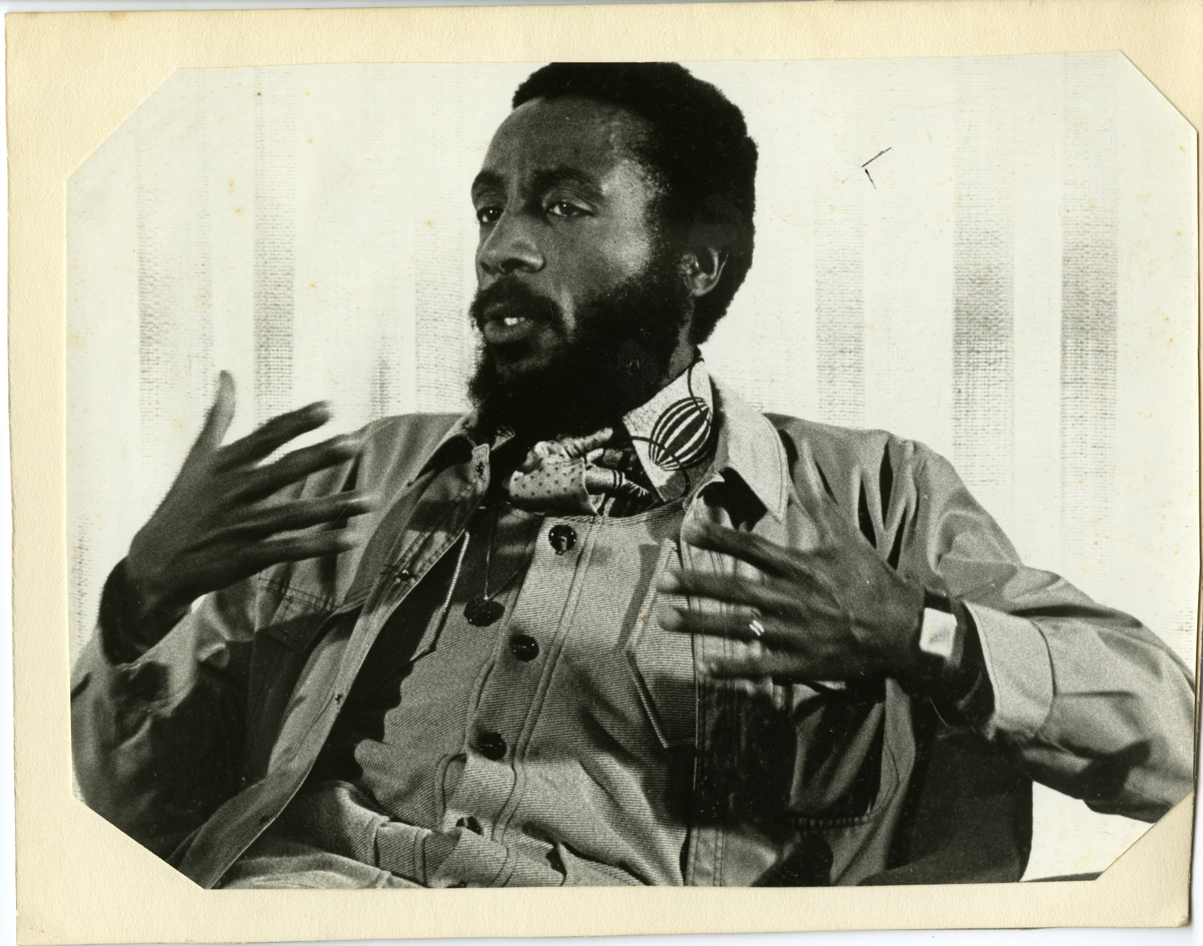 Black and white image of legendary actor, comedian, and activist Dick Gregory speaking in a show or giving a lecture.