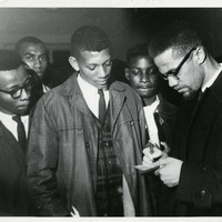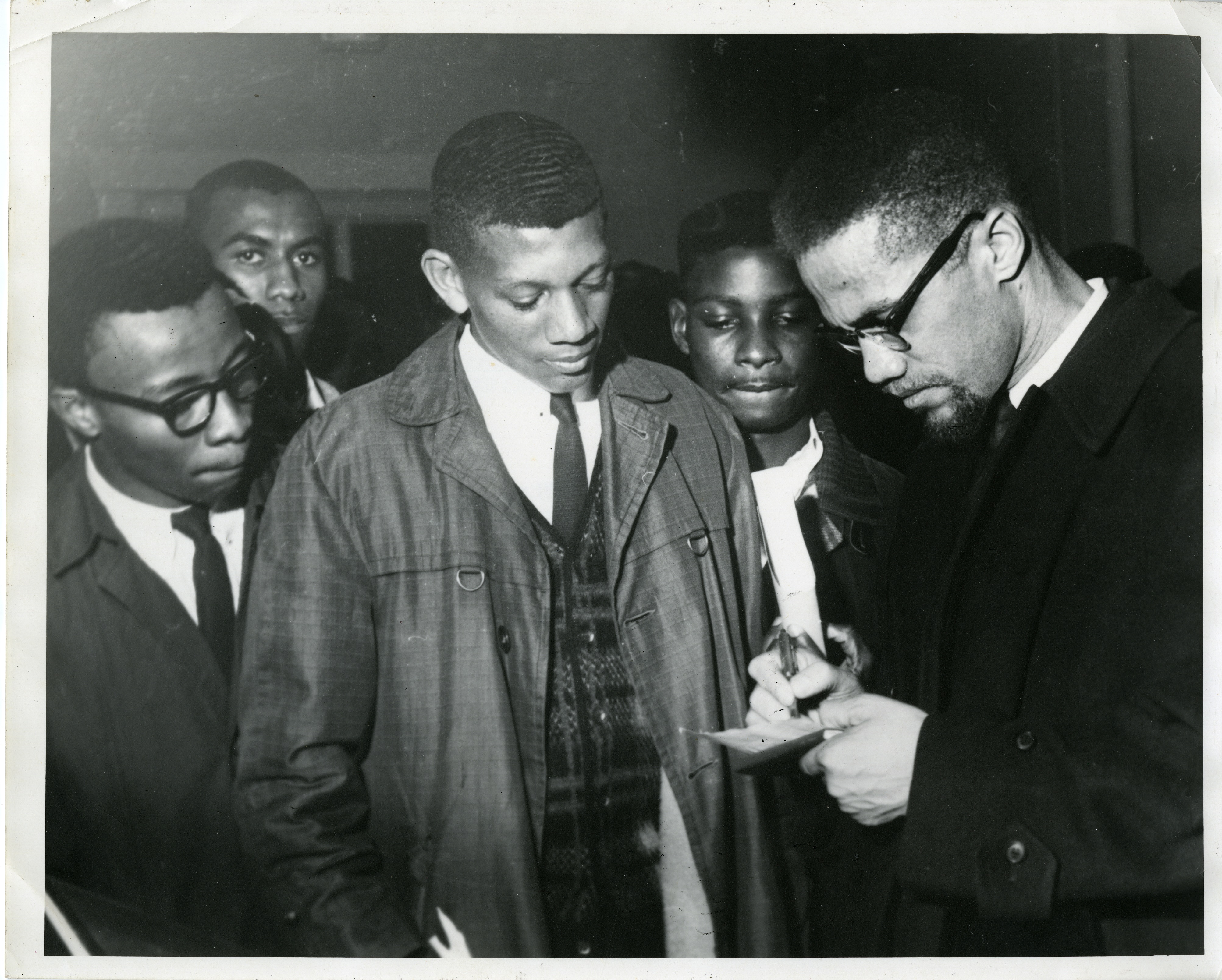 Black and white image of Malcolm X signing a paper for an unidentified young man.