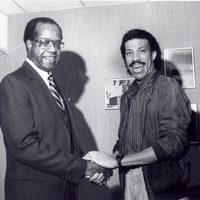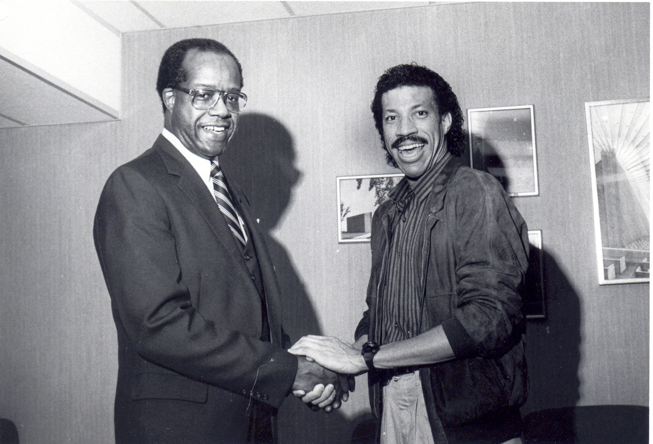 Black and white image of Dr. Benjamin F. Payton, Tuskegee University's fifth president, with singer songwriter Lionel Richie.