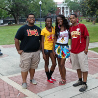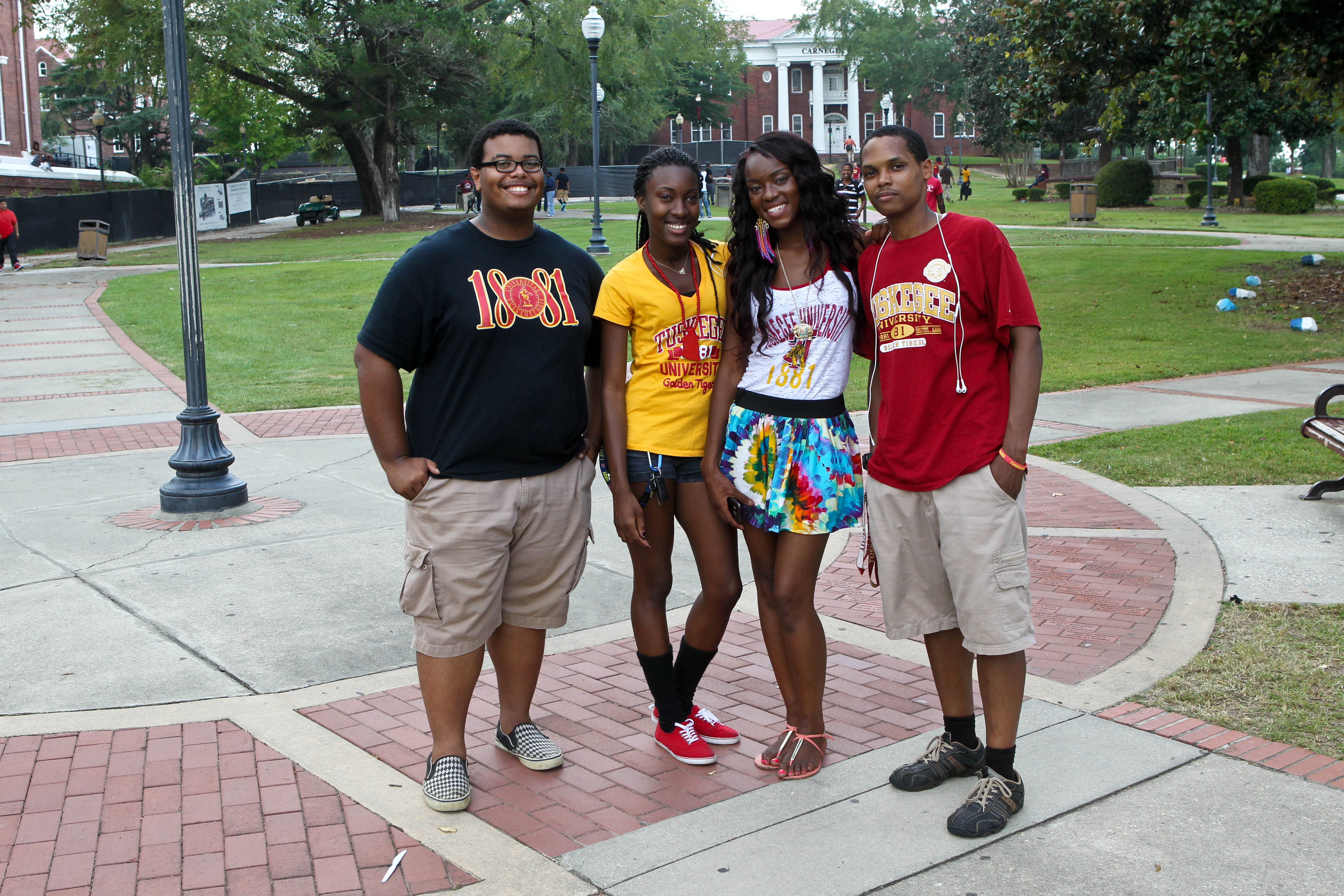 Four Tuskegee students on the quad in front of Carnegie Hall and by Tompkins Hall.