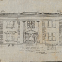 A construction front elevation drawing blueprint of the Library Building at Wiley University. This drawing the front face of the building depciting stone placement, brick placement, window and light placements, and pillars.
