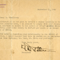 A letter from the third President of Tuskegee University, Dr. Frederick D. Patterson, confirming that Charles G. Gomillion will receive an increase in salary and continue his work at Tuskegee University.