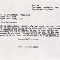 A letter from Charles G. Gomillion to President Frederick D. Patterson acknowledging his receipt of the 09/11/1940 letter and accepting increase in pay to continue working at Tuskegee.