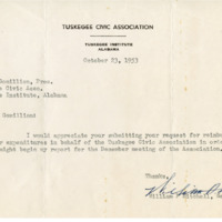 A letter from the Tuskegee Civic Association secretary William P. Mitchell to the president Charles G. Gomillion advising advising him a request for reimbursement.