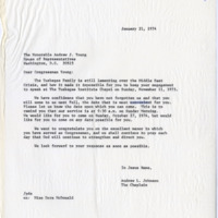 A letter from Chaplain Johnson to Andrew Young offering support and asking if he can preach on 10/27/1974.