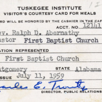 A visitor pass issued from Tuskegee Institute to Rev. Abernathy to eat at the cafeteria after the sermon.