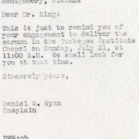 A letter from Chaplain Wynn to Dr. Martin Luther King Jr. on onion skin paper reminding Dr. King of his preaching engagement on 07/31/1955 at Tuskegee Institute’s Chapel at 11am.