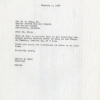 A letter from Chaplain Wynn to Dr. Martin Luther King Jr. on onion paper thanking Dr. King for allowing his choir to sing on 01/05/1956 at 9pm.